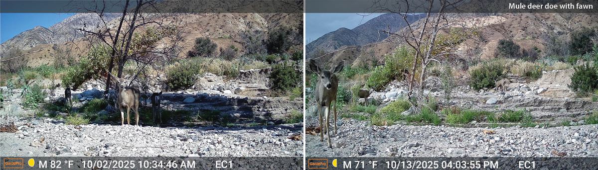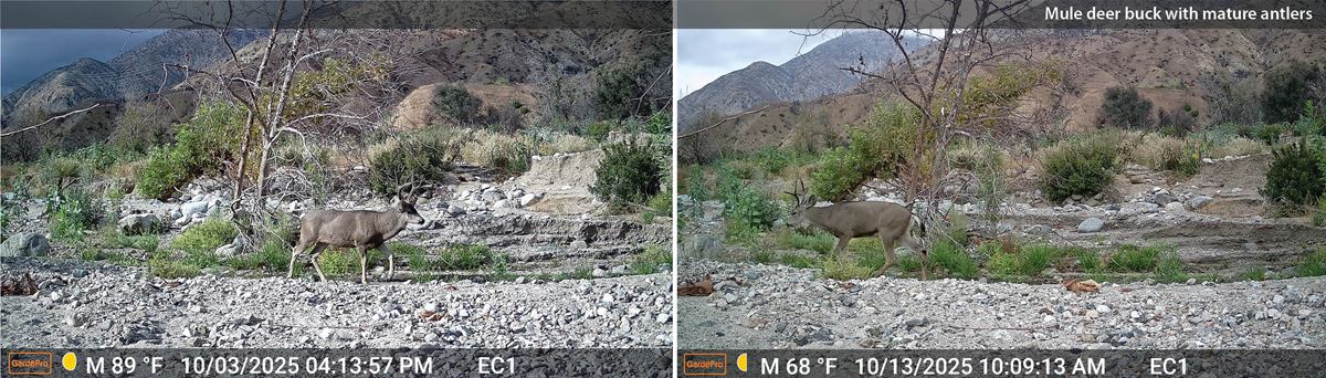 “Though the park remains closed, our trail cameras often catch quiet moments of mule deer wandering through the recovering landscape. They are most often seen moving between the oak woodland, chaparral, and alluvial scrub habitats along the wash. These areas provide both cover and food, and the wash itself offers a reliable travel corridor through the canyon. They play a quiet but important role in the ecosystem, dispersing seeds and helping shape the vegetation structure through selective foraging,” shared LA County Parks Biologist, Cristhian Mace.